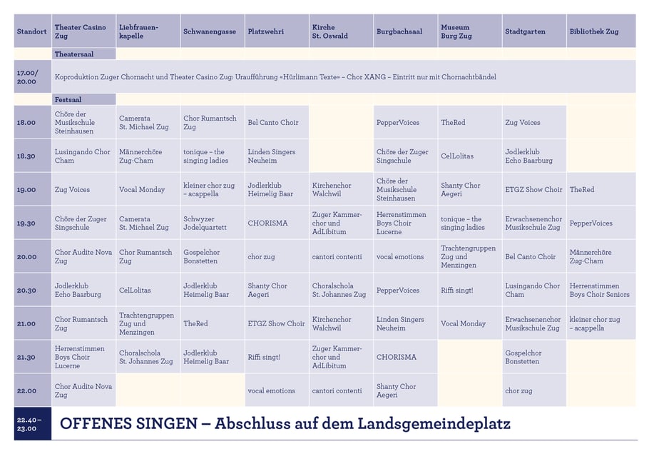 Am 13. September 2025 treten auf zehn Bühnen in der Zuger Altstadt und im Theater Casino Zug 36 Chöre aus Zug und Umgebung auf. Hier das Programm.