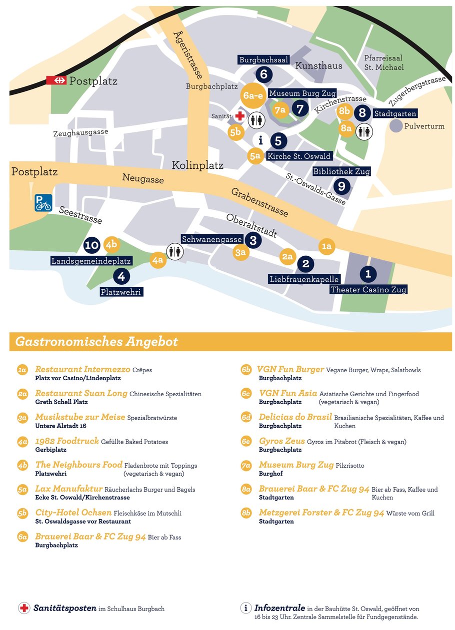 Der Wegweiser zu den Bühnen, den gastronomischen Angeboten, der Infozentrale, den Toiletten, den Veloparkplätzen und dem Sanitätsposten.